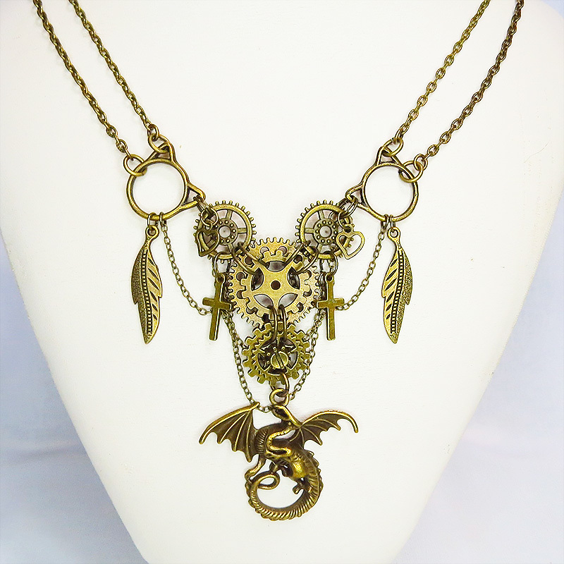 - スチームパンク風 ドラゴン(龍)と歯車を組合せた多層多重ダブルチェーンネックレス アジャスター付