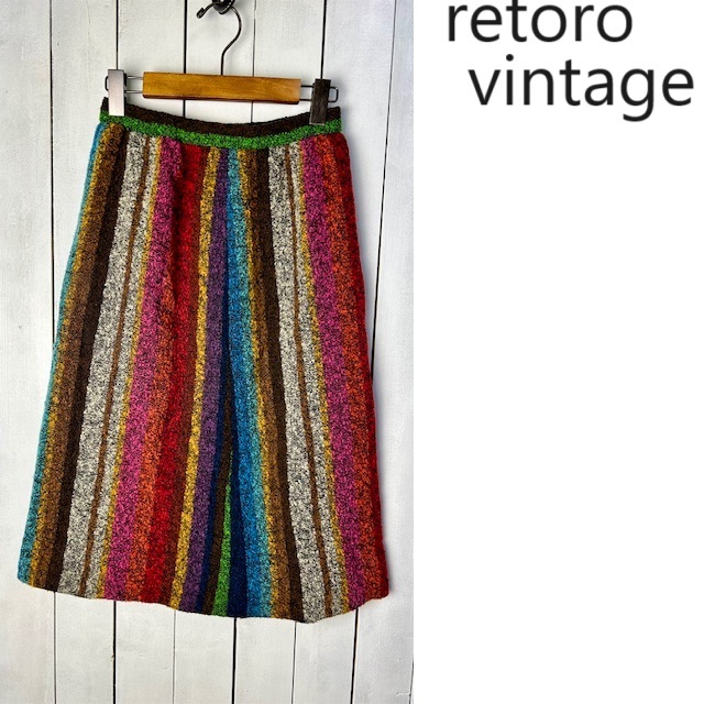 > 昭和レトロ古着 70s~ モコモコパイル生地 カラフルストライプスカート S程度 膝下 オールド ヴィンテージ ロングスカート 秋冬 厚手●326