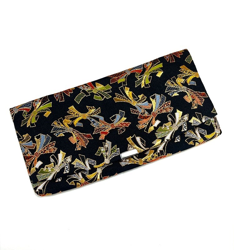 - 花とら●リサイクル バッグ 数寄屋バッグ 茶道 お茶席 小物入れ 黒地 帯地 熨斗柄 231224