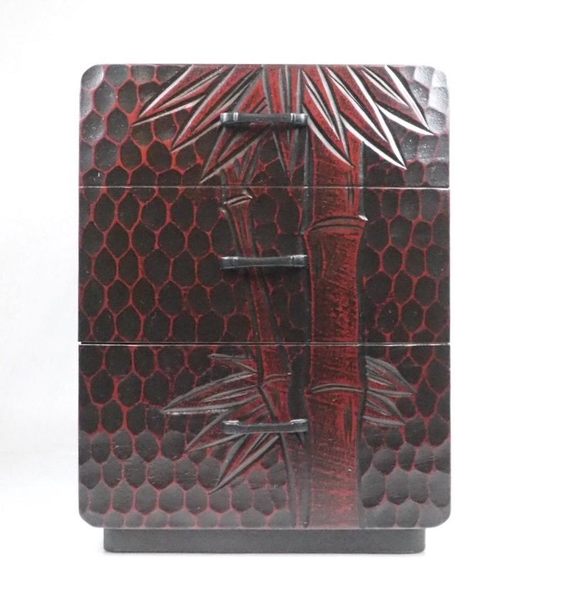 - 使いやすさだけでなく、鑑賞する楽しさも併せ持つ作品!熟練の職人が施す美麗な彫刻! 鎌倉彫 三段箪笥 三つ引き箪笥 竹 1990年代 SKT601