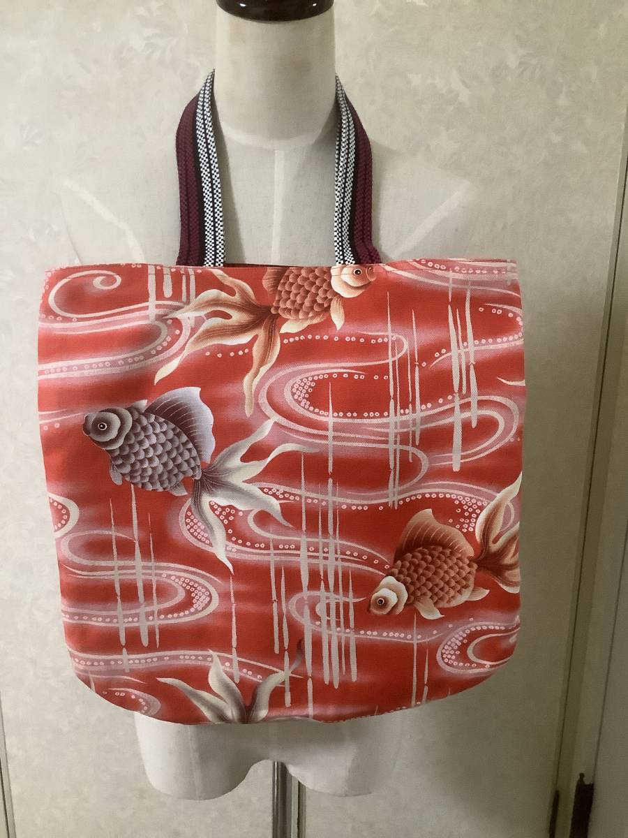 - ハンドメイド 10番オックス&シーチング トートバッグ 綿100% 和柄 酒屋前掛け紐 えんじ / 金魚 和調 エコバッグ 和風 サンプル品