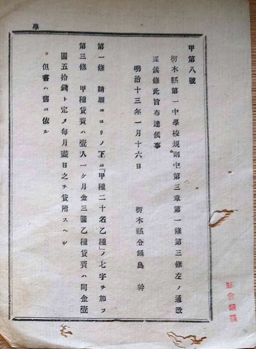 - f24012904〇明治布告布達 栃木県第一中学校規則改正 栃木県 明治13年〇和本古書古文書