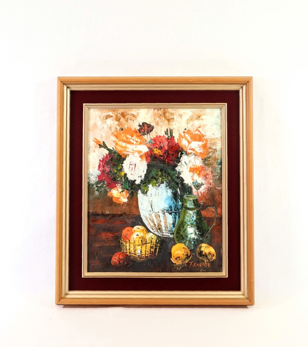 - 真作 片瀬剛志 油彩「ばらと静物」画寸 F8 広島県出身 無所属 元現代美術協会会員 暖色系の背景に存在感のある薔薇 清艶な雰囲気 8503