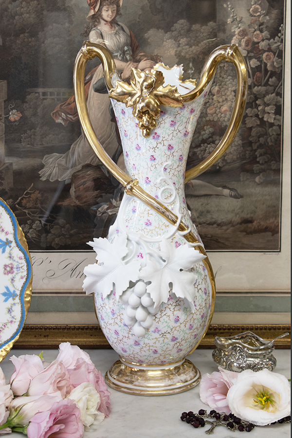 ボディの中央には、ゴールドの枝から垂れ下がる葡萄の葉と実。なんの色も付けられていないその部分は、素焼きの状態で仕上げられています。