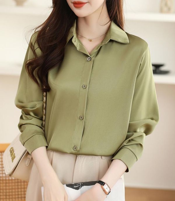 - 春新品 / ブラウス レディース 長袖 キレイめ 大人 オフィス 通勤 上品 つるつる サテン トップス 長袖 ブラウスシャツ 緑