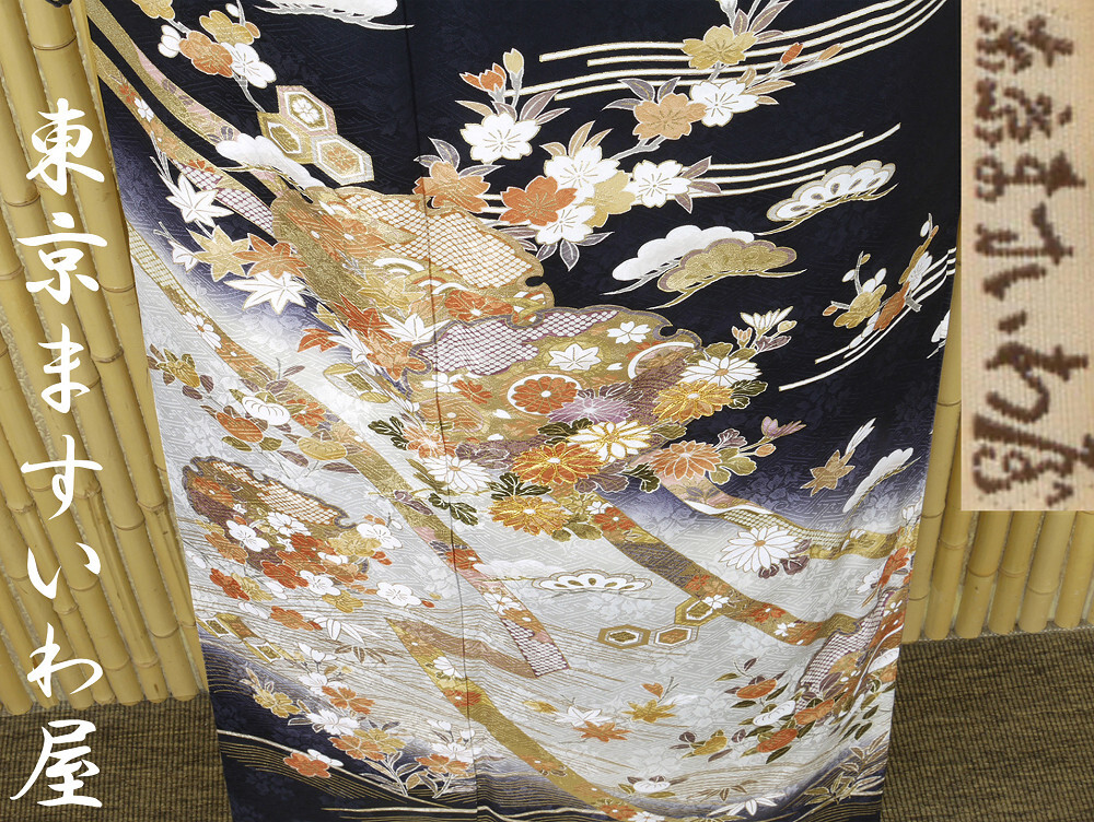 - 【京かんざし】82★訪問着 本加工 金駒刺繍「東京ますいわ屋製」黒地身丈167.5 cm裄丈67.5 cm★即決送料無料!