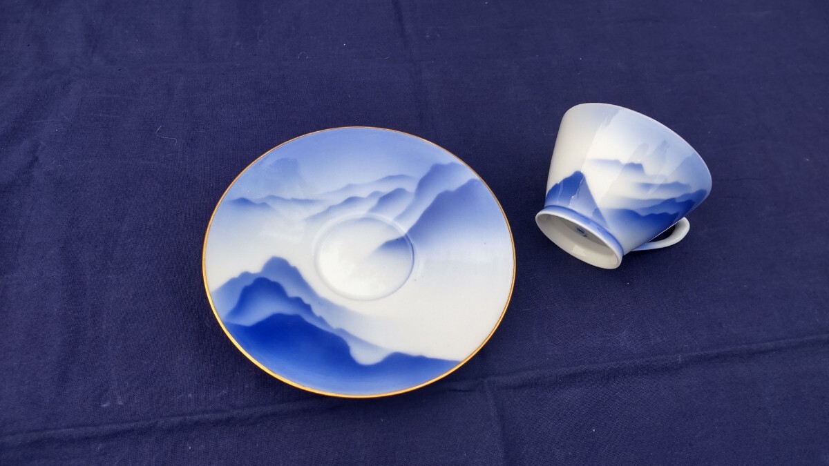 - オールド香蘭社 カップ&ソーサー 濃み技法山並風景 推定大正期