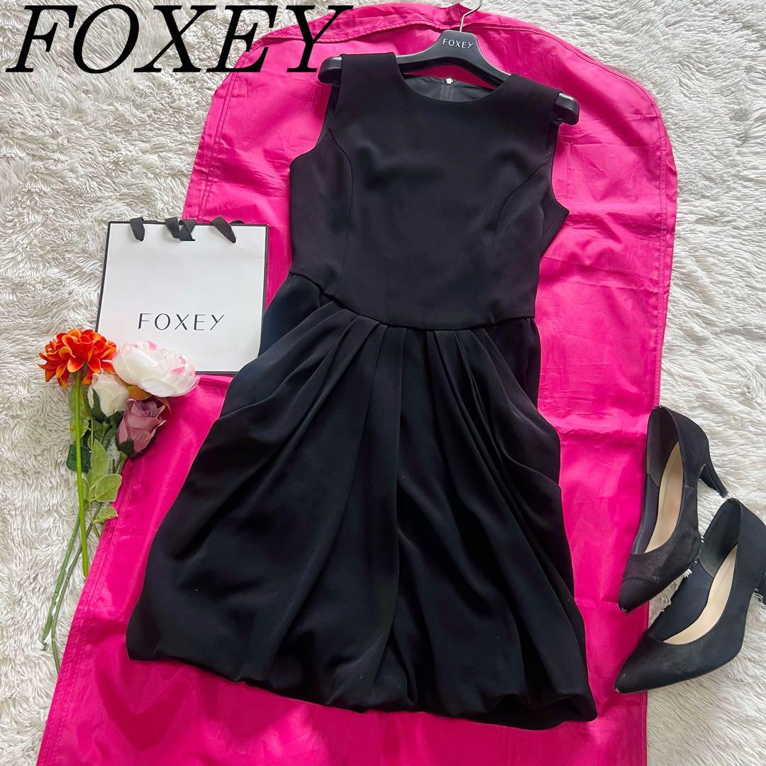 - 【美品】FOXEY NEW YORK 膝丈ワンピース ブラック 38 フォクシーニューヨーク M 黒 ノースリーブ ドレープ