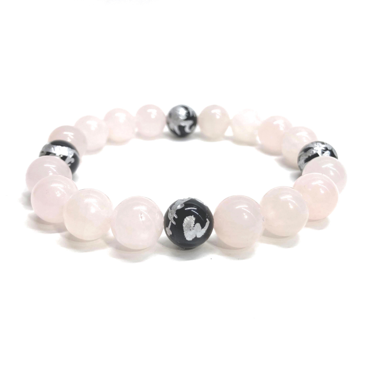- 10mm 四神獣銀彫オニキス×ローズクォーツ パワーストーン ブレスレット天然石 運気上昇 開運 金運 恋愛運 お守り 青龍 白虎 玄武 朱雀