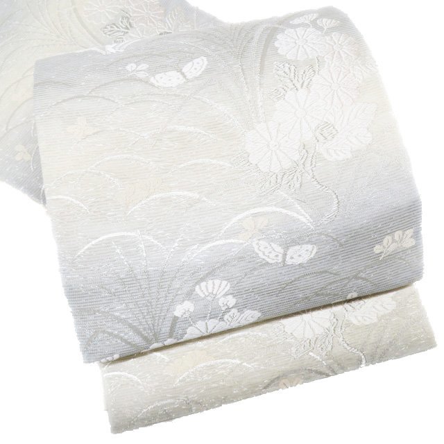 - 夏物 袋帯 中古 リサイクル 正絹 フォーマル 仕立て上がり 六通 草花模様 秋草 灰白色 灰青色 銀 きもの北條 A987-15