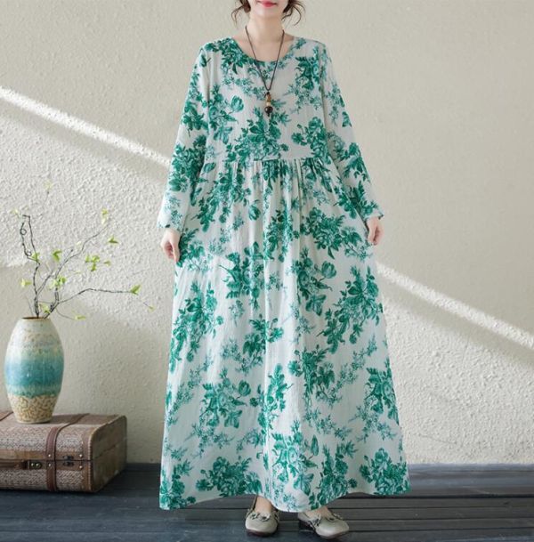 - 新品 *ナチュラル ゆったり 綿麻ワンピース きれいめ 小花柄 長袖 ミモレ丈 着痩せ 大きいサイズ ロングワンピース *6