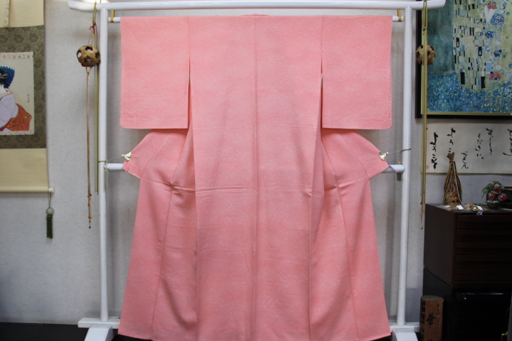 - きもの今昔6640 色無地きもの 広衿袷手縫い仕立て 一越ちりめん生地に薄紅色の和紙折染 問題なし 身丈162cm
