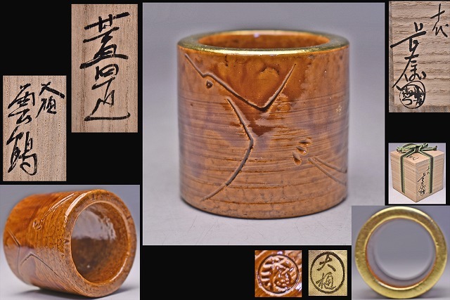 - 大樋長三郎 10代 ★ 大樋雲鶴 ★ 蓋置 ★ 共箱 共布 ★ 大樋釉 ★ 茶道具 ★ 鳥文様 ★ 飴釉 ★ 大樋年朗