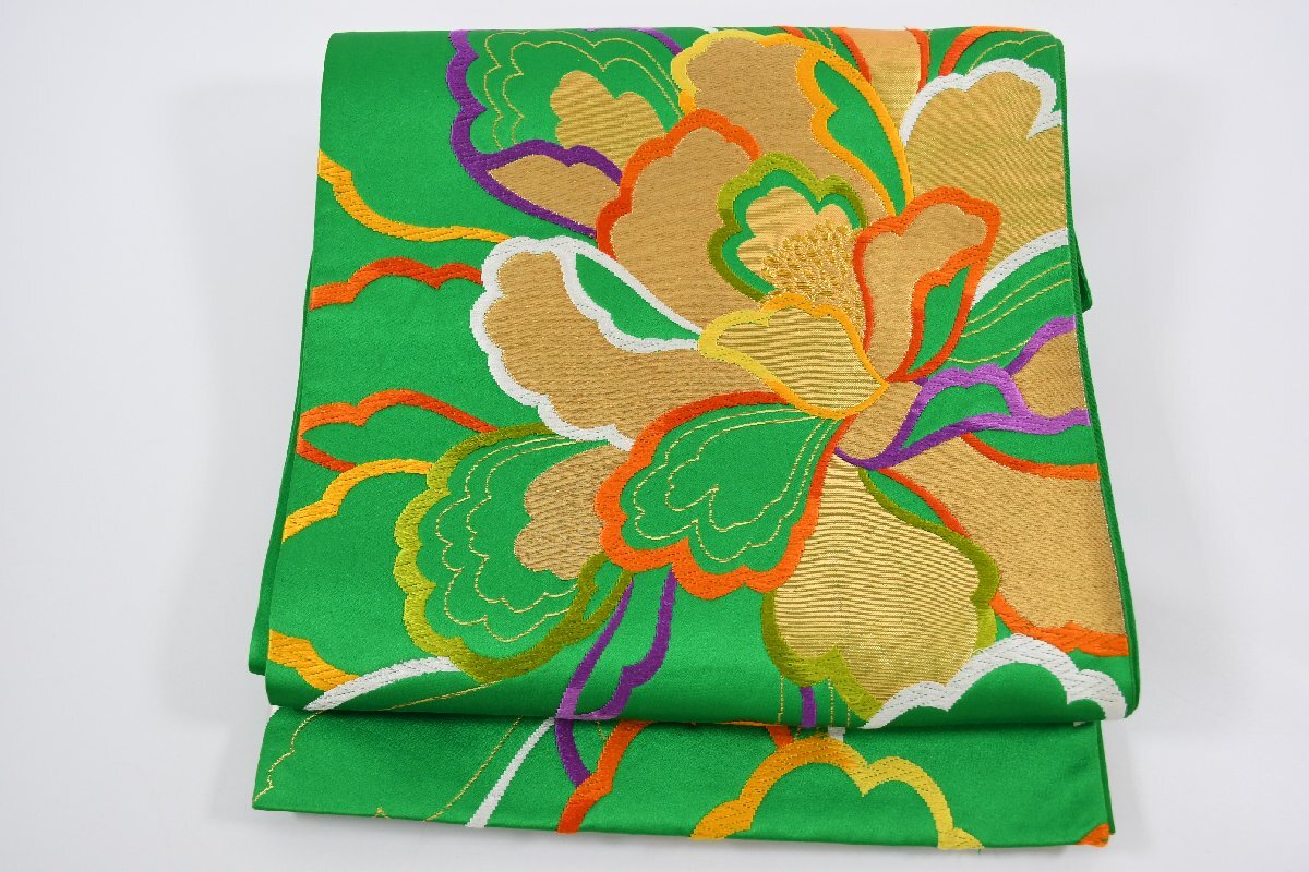 - 袋帯 未仕立て 花 緑 六通柄 帯丈420cm ★着物屋 ne-8639 桜庭呉服店