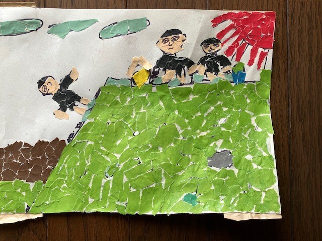 - 丘 おか 太陽 雲 緑 貼り絵 色紙 横25㎝ 縦17.6㎝ 昭和45年 当時物 小学生の作品 送料無料