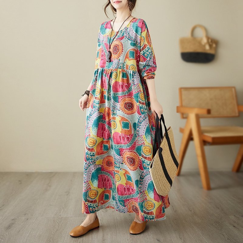 - A5592☆新品秋レディース カジュアル おしゃれ ゆったり大きいサイズ 体型カバー プリント 長袖ロングワンピース 赤