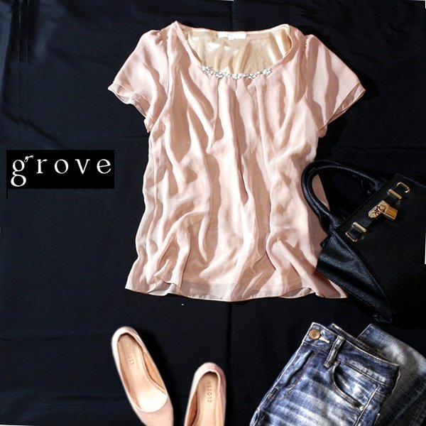 - ☆☆ 美品 (株)ワールド grove グローブ ☆☆ 綺麗め ビジュー・ビーズ付き シフォン カットソー M 春 夏 23D07