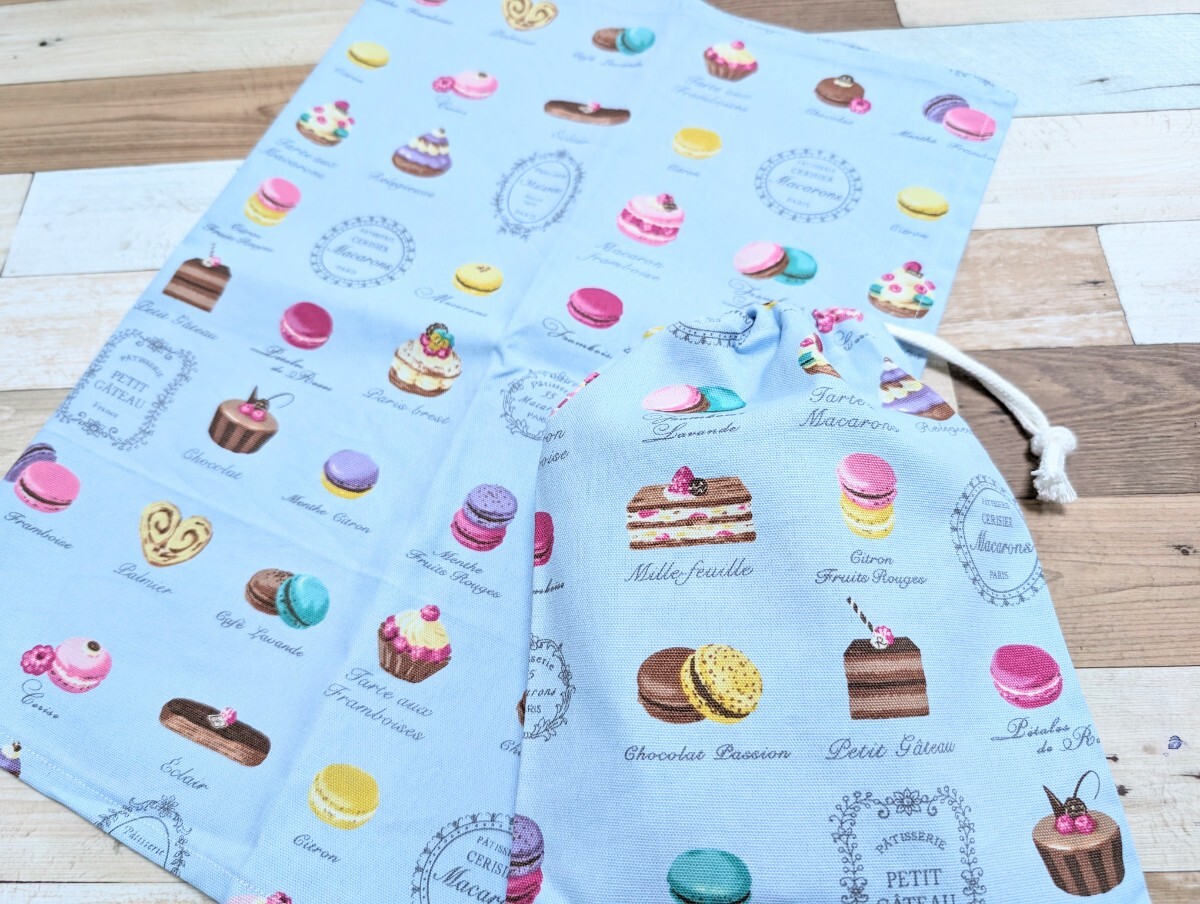 - *40×60cm*ハンドメイド*ランチョンマット・巾着袋給食セット*マカロン×ブルー*入園・入学・新学期準備*小学校