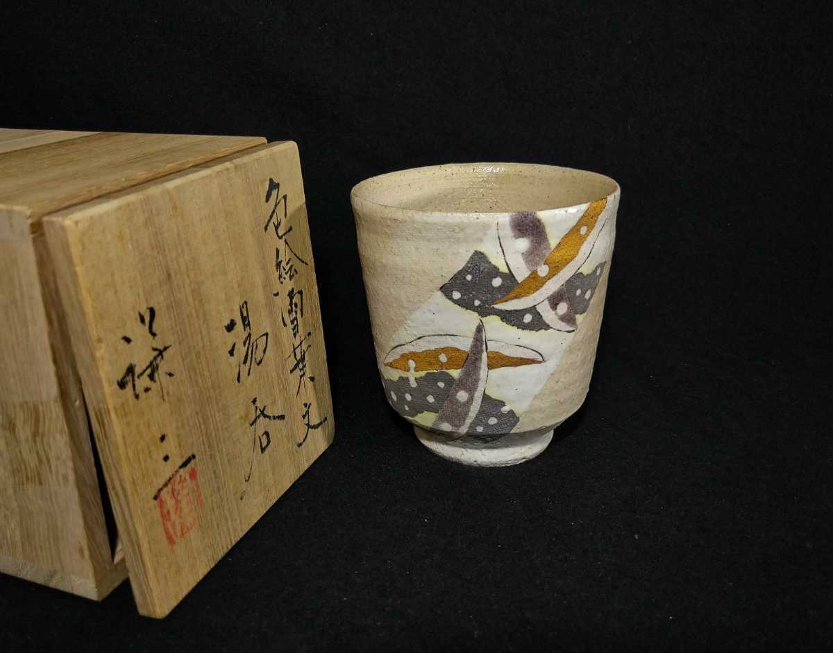 - 岡田謙三 「色絵雪葉文」 色絵 葉に雪文 湯呑 共箱 煎茶道具 益子焼 b-32g506