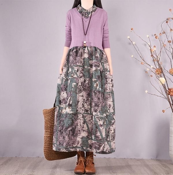 - LC148 綿麻風 重ね着風 ロングワンピース ゆったり 体型カバー 大きいサイズ aラインワンピース パープル/Lサイズ