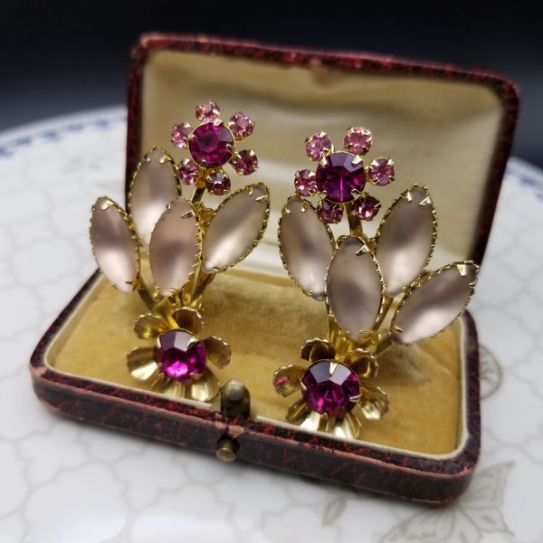 > 60'70's Judy Lee ピンクのお花 フラワーモチーフ マーキスカット 摺りガラス ヴィンテージ イヤリング レトロゴージャス 存在感 Y15-O
