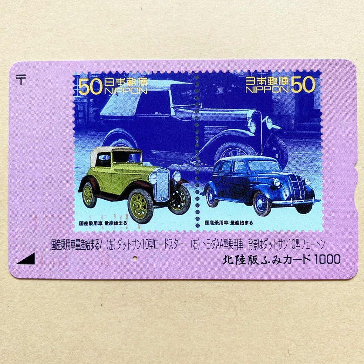 - 【使用済】 ふみカード 北陸版 国産乗用車量産始まる (左)ダットサン10型ロードスター (右)トヨダAA型乗用車