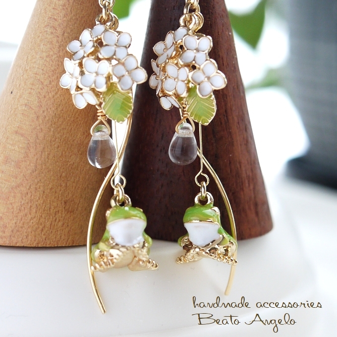 > ◇◆+angelo+紫陽花とカエルチャームのピアス(p-001)ホワイト グリーン G 梅雨 雨 フラワーチャーム ドロップ