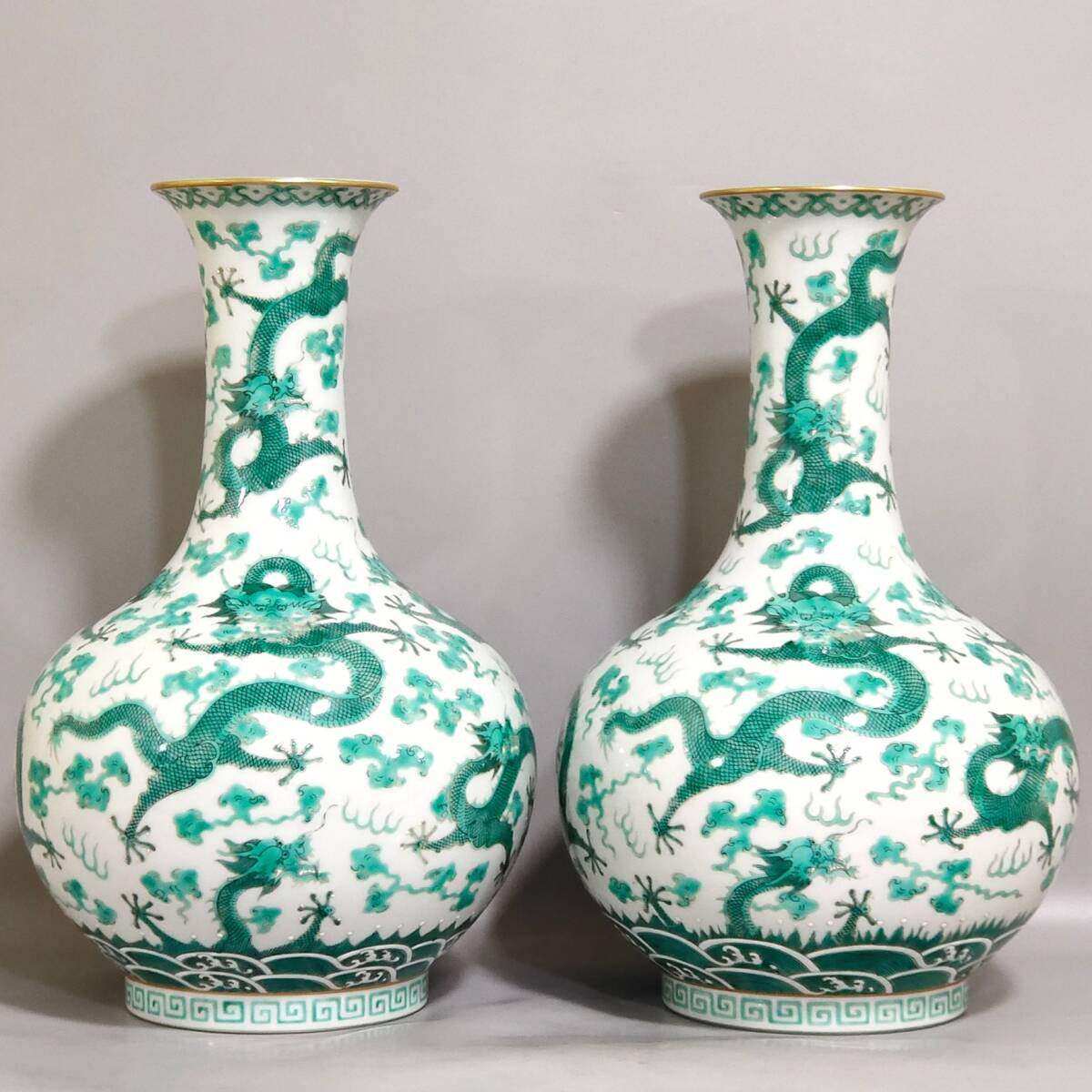 - 大清嘉慶年製款 祥雲九龍賞瓶一対 陶磁器 中国美術 工芸品 唐物 置物 賞物 CH03