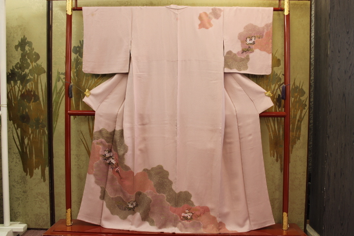- きもの今昔6967 付け下げ訪問着 広衿袷手縫い仕立 正絹変わり織梨地 一斤染(和名いっこん染)桶絞り道長取り