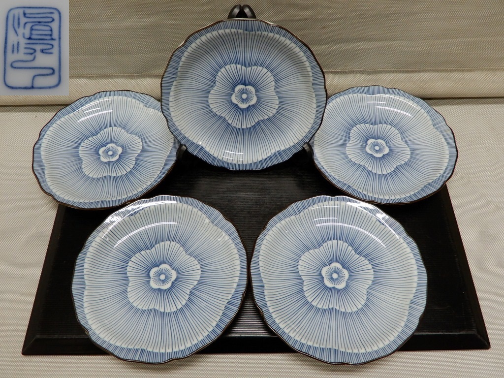 > ●有田焼 染付 三連梅柄 中皿 5枚 梅模様 約16.2㎝ 在銘 慎一 和皿 和食器 銘々皿 千筋梅●