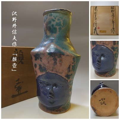 - 【T-182】沢野井信夫 作 「顔壺」共箱付 モダンアート