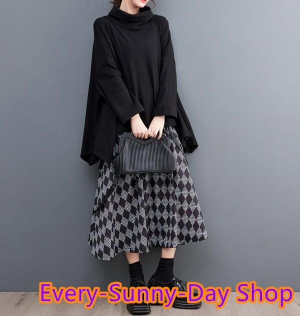 - Fサイズ 春 カジュアル ハイネック チュニック 無地 ドルマン袖 ゆったり 体型カバー 大人 長袖 トップス 黒 K0299