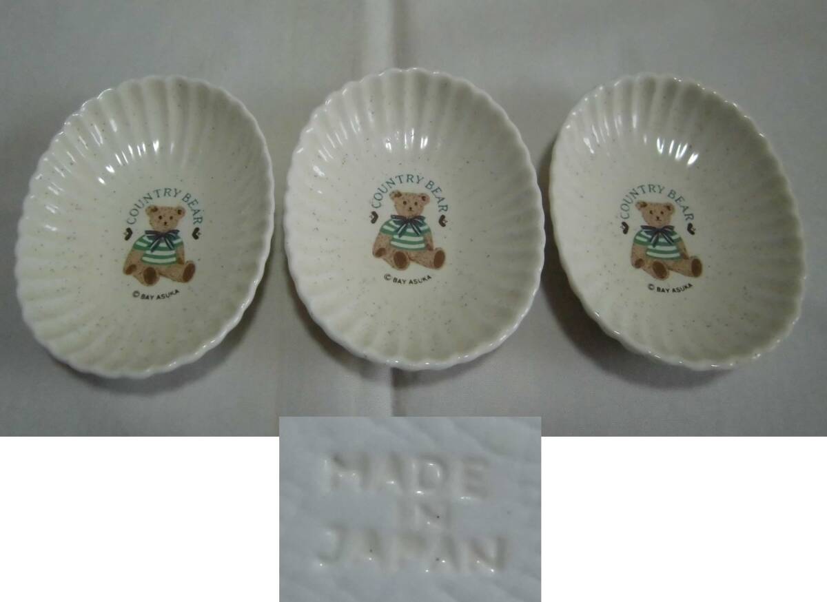 - 小皿 豆皿 くま柄 3枚 カントリーベア BAY ASUKA 日本製 楕円 小判形 白磁 陶器 工芸品 レトロ