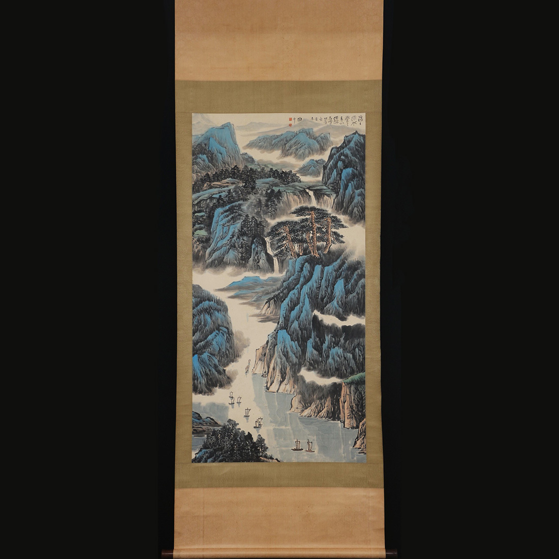 > 古美術 掛け軸 中国・近現代 「何海霞書」 紙本 【緑水青山図】 立軸 書道 巻き物 真筆逸品 肉筆保証 唐物 古画 LT-24554