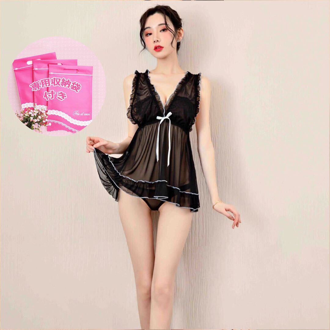 - レディース ベビードール レース花柄 コスプレ衣装 ナイトウェア ワンピース セクシー人気 透け リボン飾り 花柄レース かわいい黒 1388