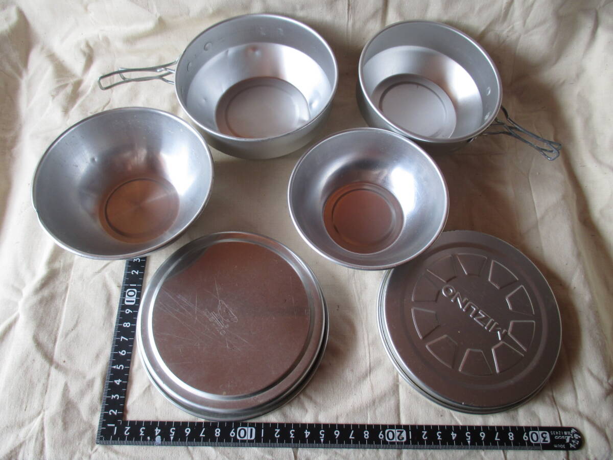 - 珍品フリマ]キャンプ用品 アルマイト?食器大中2組セット ミズノ製?(大…蓋と碗2つが揃い。中…蓋は不揃い、碗2つは揃い)