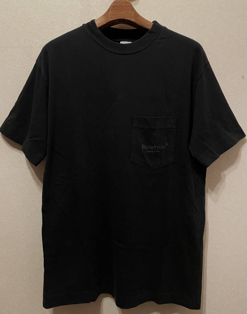 > ITALY製90sオールドBENNETTONポケットTシャツM~ビッグシルエットSコットン袖裾シングル黒ブラック90年代ベネトン希少ロゴ胸ポケTビンテージ