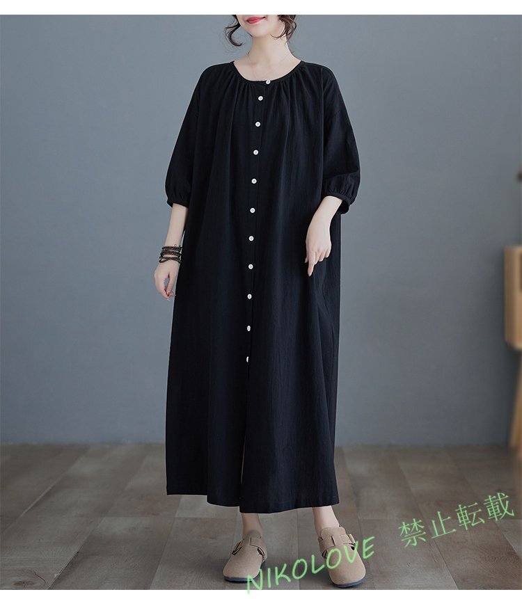 - 新品レディース 綿麻 カジュアル ゆったり大きいサイズ体型カバー ロング丈 長袖ワンピース 黒 LH303