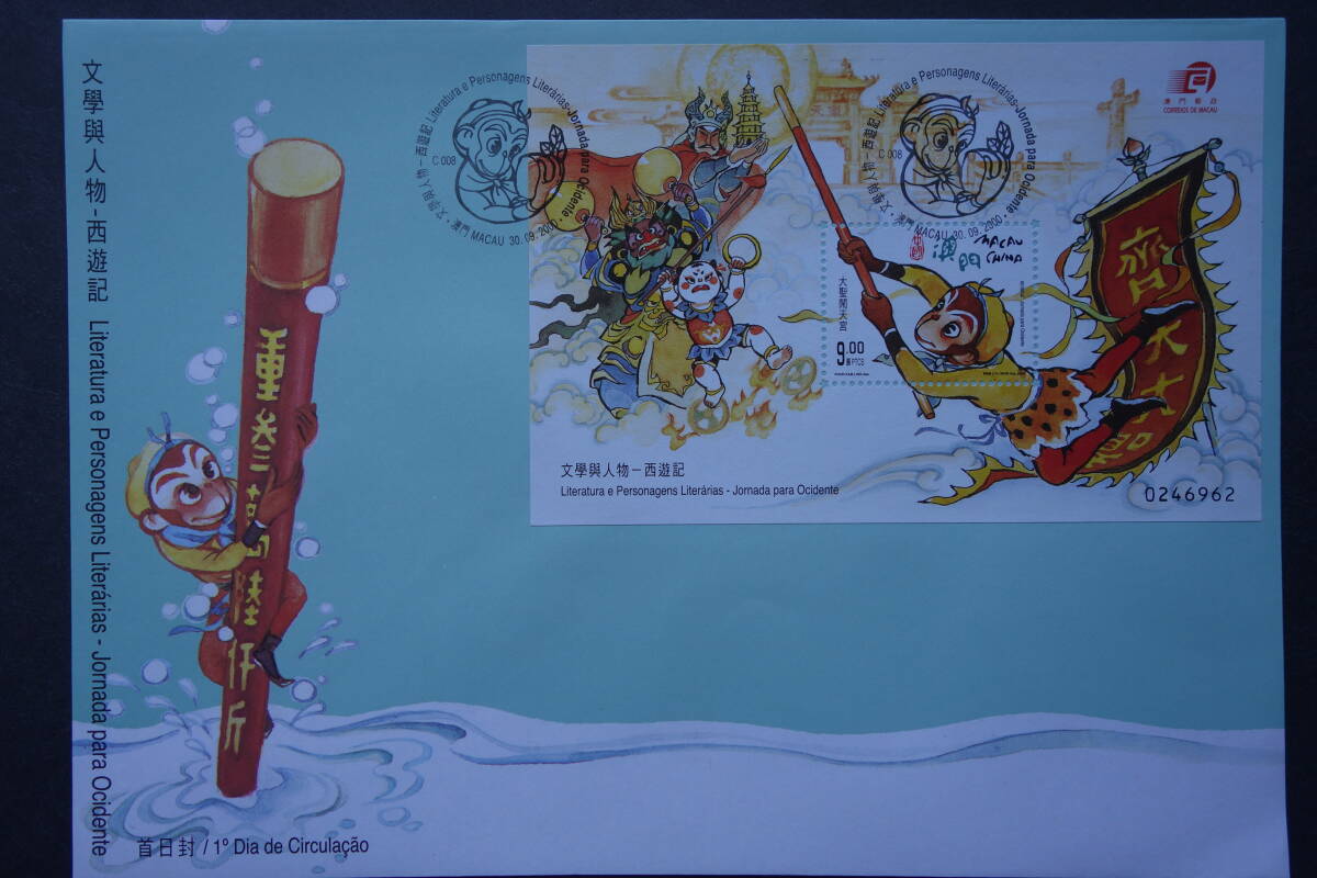 - 外国切手: 中国マカオ切手「西遊記」 小型シート貼り FDC(初日カバー)