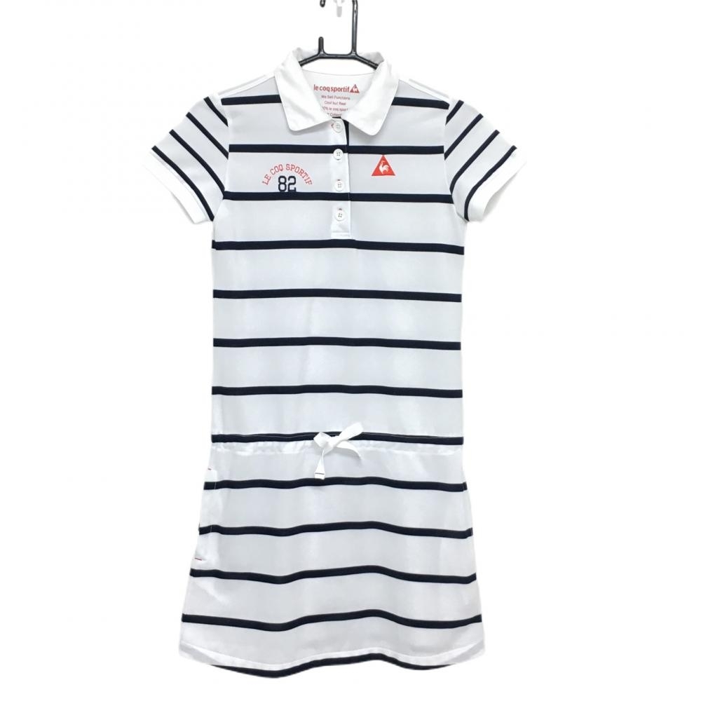 - ルコック 半袖ポロワンピース 白×ネイビー ボーダー柄 ロゴ刺しゅう ウエスト調節紐 レディース M ゴルフウェア le coq sportif