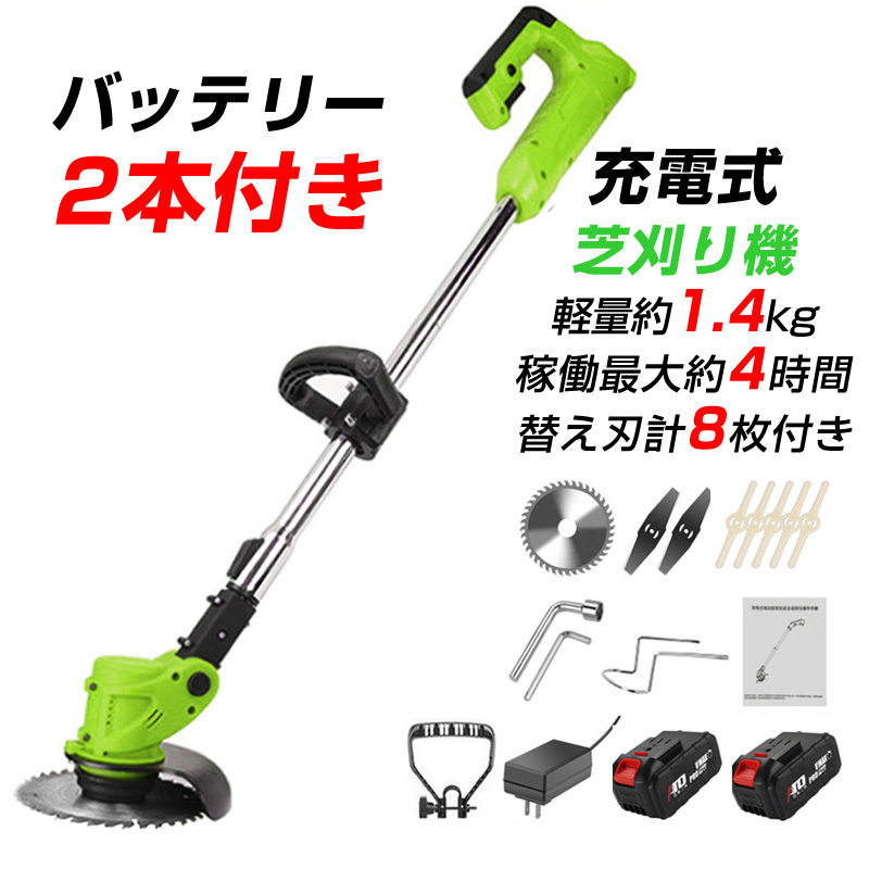 - 電動草刈り機 コードレス バッテリー2本付き 充電式 芝刈機 刈払機 高枝切り 変え刃付き 安全 女性使える 家庭用 初心者 軽量 雑草 芝生 庭