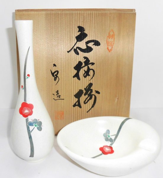 - FD45★応接揃★花瓶/灰皿 セット★木箱入り★梅絵柄★一輪挿し★昭和レトロ★フラワーベース★