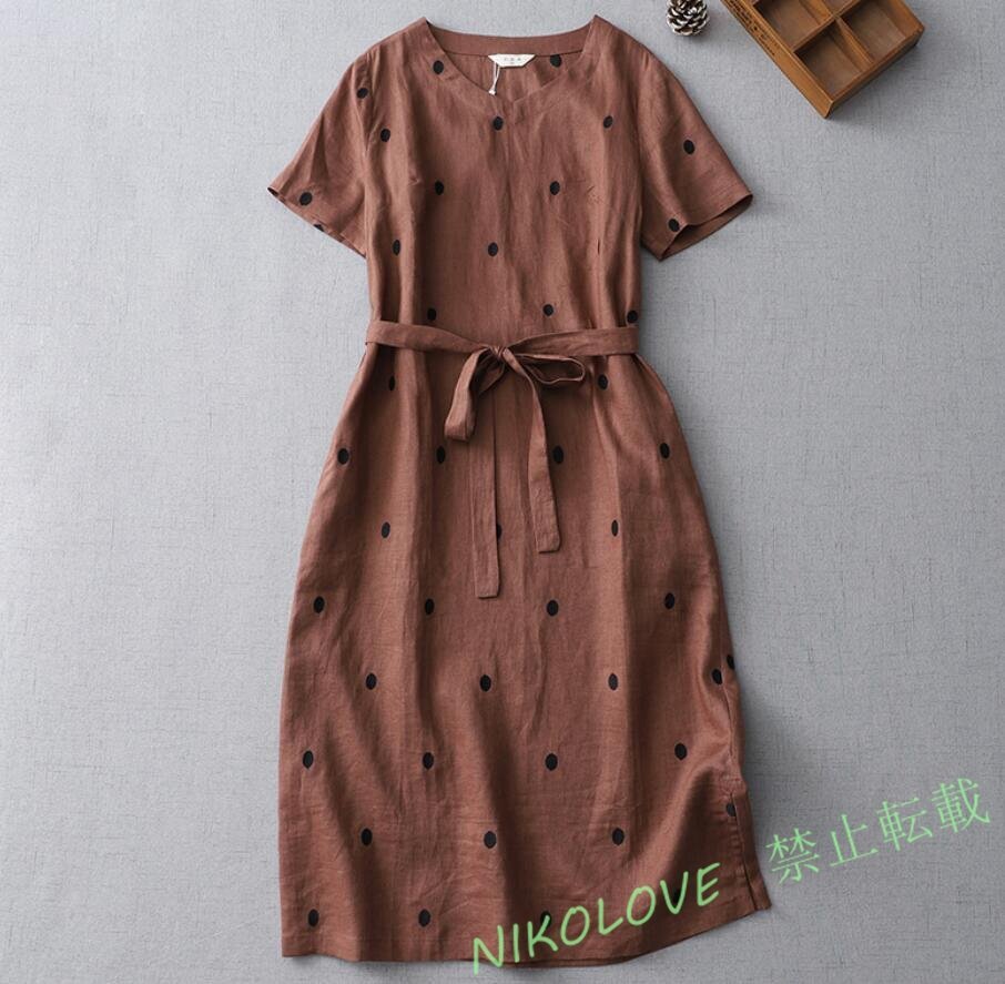 - 新品春夏フレア ワンピース ドット柄 半袖 カジュアル ワンピース ロングワンピース 綿麻混風 ロングワンピ 軽い 涼しい コーヒーLH782