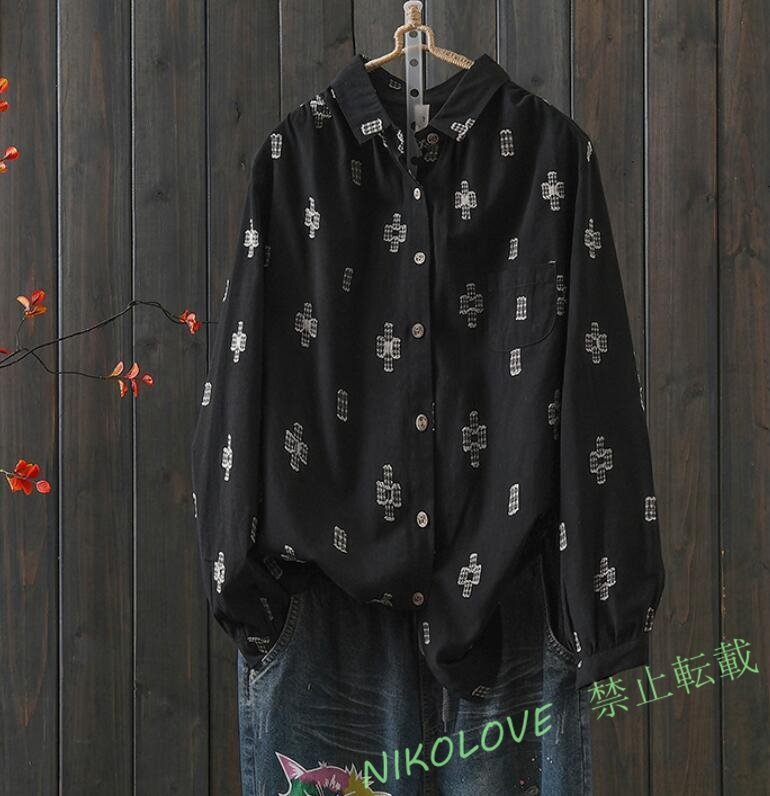 - 新品カジュアル 復古風 シャツ ブラウス 綿麻 トップス レディース チュニック プリント 長袖 大きいサイズ 体型カバー 黒 LH747