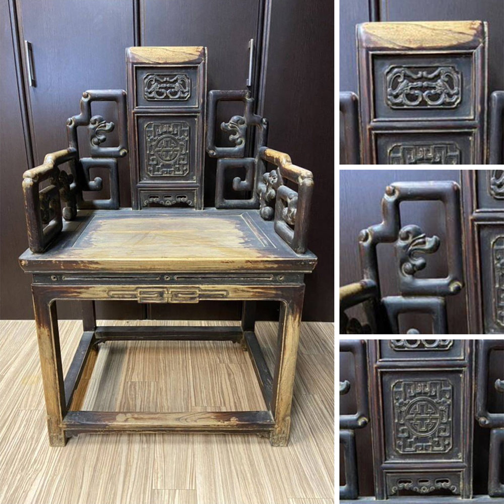 > 【中国美術】 ★ 清式 唐木彫拐子龍太師椅 ★ 清朝期 団寿 草龍 細工彫刻 明清家具 検 清代清時代紅木官帽椅子紫檀黄花梨唐物骨董古玩