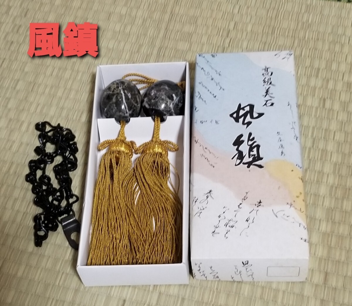 - T-316 【美品】高級美石 風鎮 ふうちん 床の間 インテリア 天然石/黒 房/金色 掛軸 伝統品 中古品 古風