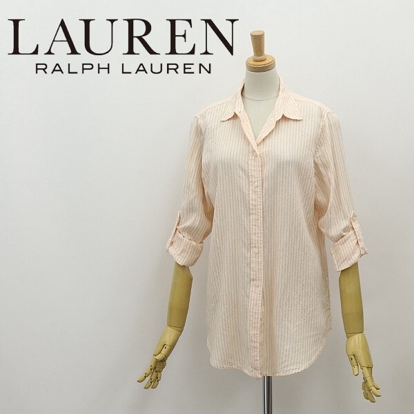 - 国内正規品◆RALPH LAUREN ラルフローレン リネン ボーダー柄 長袖 シャツ ペールオレンジ×ホワイト S