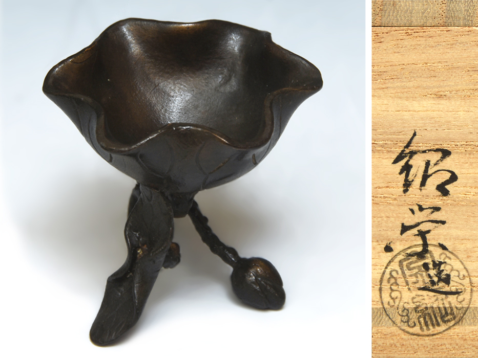 - 金森紹栄(造)唐銅蓮蓋置 共箱 共布 しおり 茶道具 重量:71g 金属工芸 現代工芸 釜道具 z7752a