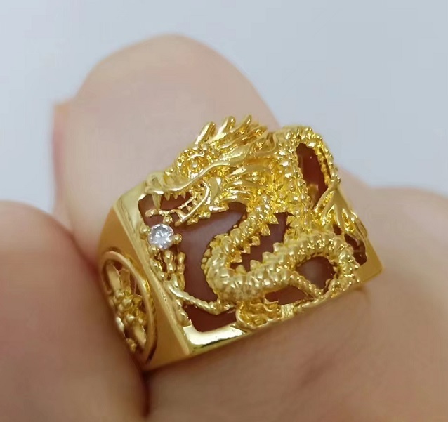 - 豪華 覇気 龍柄 指輪 メンズ 24KGP ベトナム砂金 メッキ加工 リング アクセサリー フリーサイズ