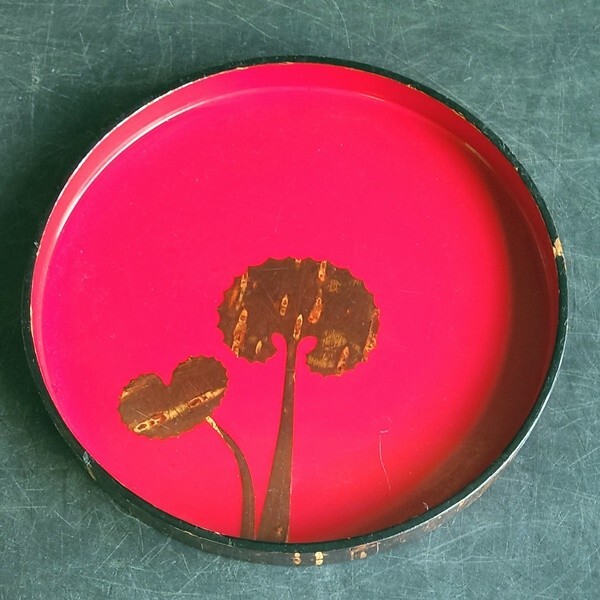 - E13 樺細工お盆 フキの葉柄 円型 24㎝